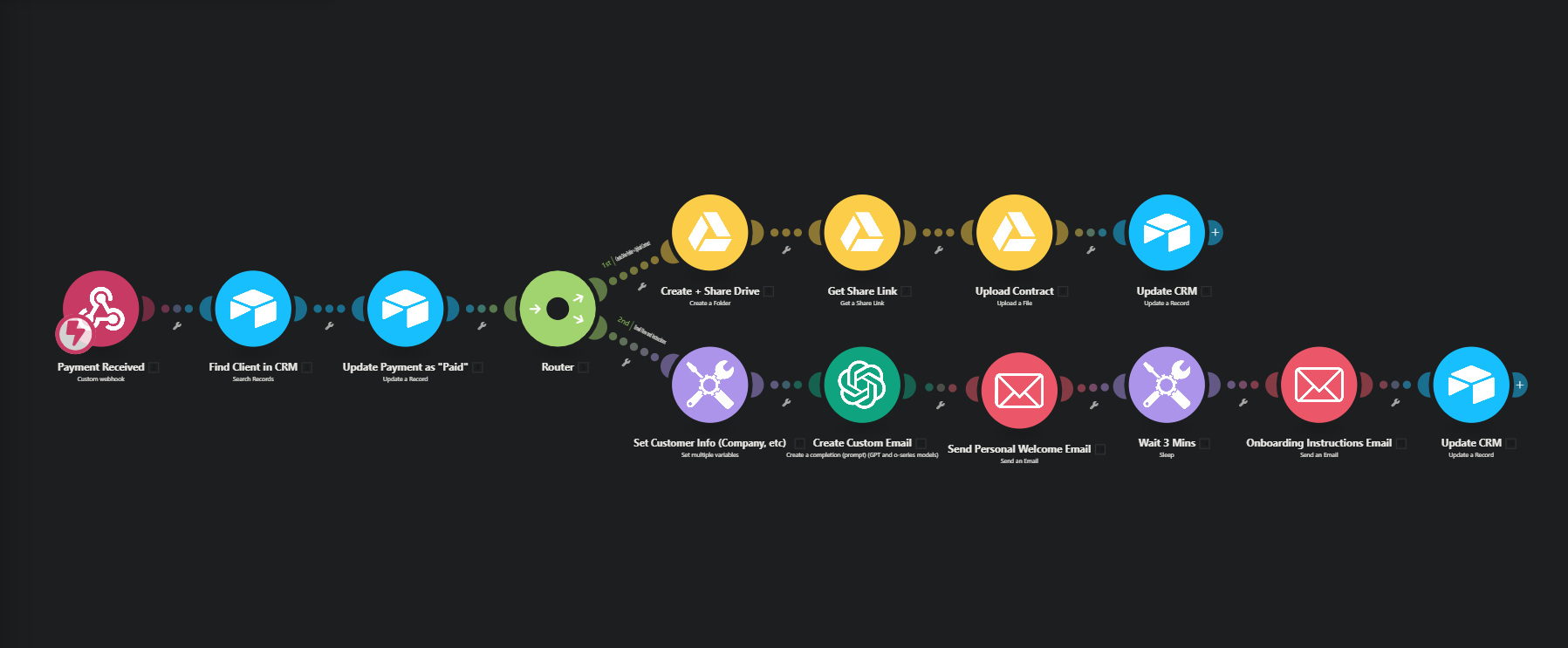 This workflow turns a successful payment into a fully-automated client onboarding sequence. It confirms the payment in your CRM, creates and shares the client’s workspace, stores the signed contract, sends a personalized welcome + step-by-step onboarding email, and updates the CRM with links and status—no manual work.